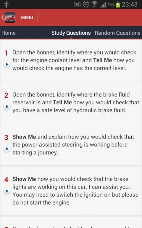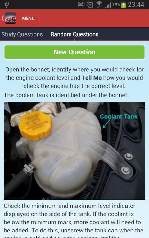 Pada awal tes mengemudi Anda, examiner akan meminta Anda dua 'Show Me, Tell Me' pertanyaan berdasarkan pemeliharaan kendaraan dasar. Aplikasi ini menggambarkan 19 pertanyaan mungkin dan memberikan jawaban dan petunjuk dengan gambar memastikan Anda awal yang baik untuk ujian!