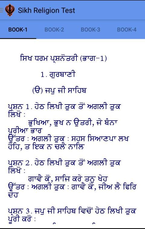 This app is based on Sikh Religion. The purpose of this app is to conduct a test which is based on the age of users such as up to 5yr, 12yr, 20yr and above 20yr. The books and syllabus of the test is included in this app. Users can read the books according to syllabus and can give the test. Book-1 is for users of age 5yr, Book-2 is for 12yr, Book-3 is for 20yr and Book-4 is for users above 20yr. The test is also based on the age of the users.This app includes Gurbani, Sikhism, Syllabus, Books, Test, Rate us, Contact us, About app, Share, Feedback etc. User has to register first and after login users are allowed to give the test. Without registration users are not allowed to give the test.