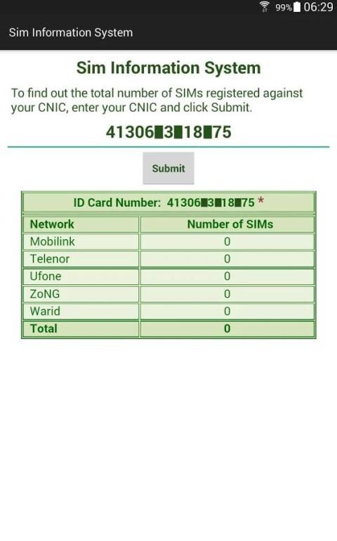 Tujuan dari ini adalah aplikasi adalah untuk memberikan fasilitas berbasis konsumen untuk pelanggan mobile di Pakistan di mana mereka akan dapat mengetahui jumlah SIM (s) terdaftar terhadap jumlah CNIC masing-masing dengan masing-masing operator seluler.