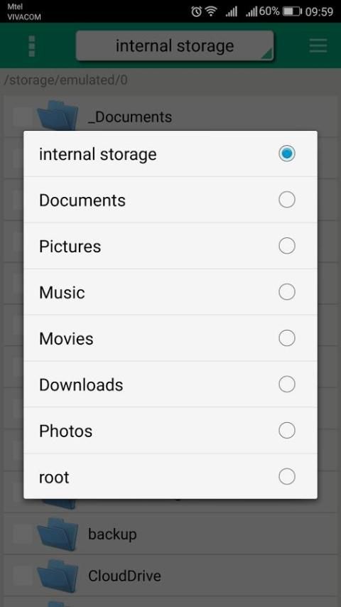 - Pilih: Penyimpanan Internal, External Storage, USB Storage dan tempat-tempat yang telah ditentukan (Dokumen, Gambar, dan lain-lain)