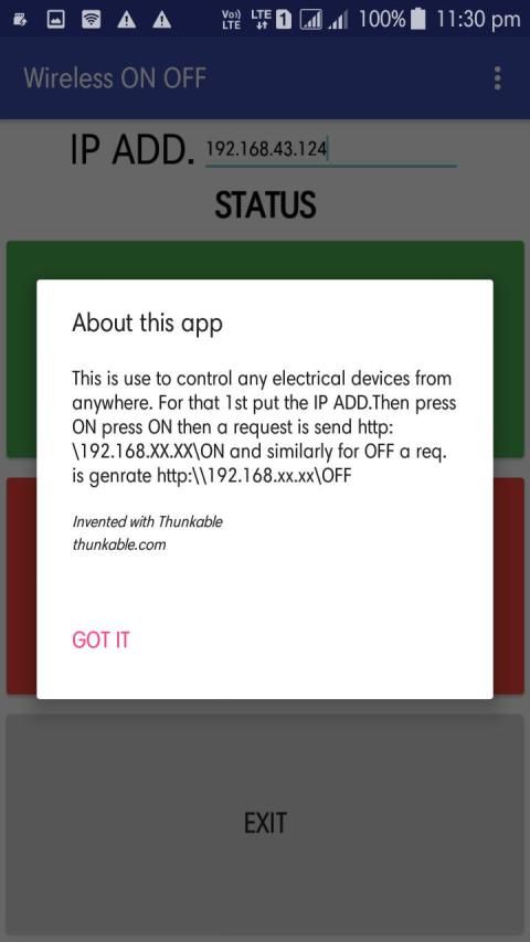 This application named "WIRELESS WI-FI LOCAL IP CONTROLLER" is basically controlling any electrical or electronic component from a local Wi-Fi network. This app application is simple to use on the Internet of Thing (IoT) project. In the coming future many updating is about to come so we are waiting for your valuable feedback.