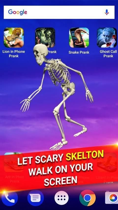 Skeleton pada layar Prank - Berjalan Skeleton dan Crawling Skeleton pada layar ponsel Anda. Berjalan Skeleton berjalan pada ponsel Anda saat Anda mengatur Skeleton untuk berjalan pada layar. Anda juga dapat memilih Crawling Skeleton di layar telepon saat terus merangkak pada layar ponsel Anda.