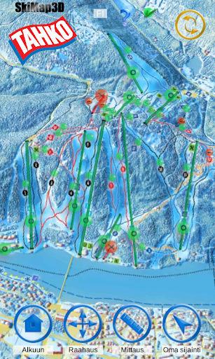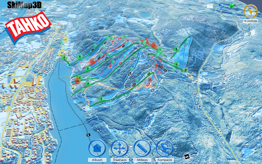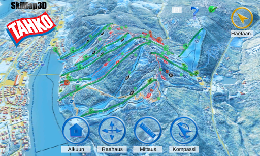 See with one glance the status of all lifts, view slopes, ski tracks among other things at Tahko from different directions and measure distances. You can also check your location in the 3D skimap. Compass and crosshair increases touch-free use.