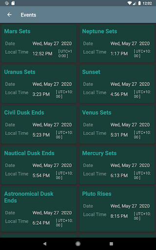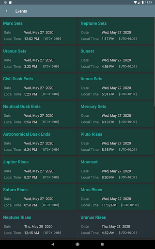 Waktu fenomena yang akan datang ditampilkan di layar Acara, termasuk: