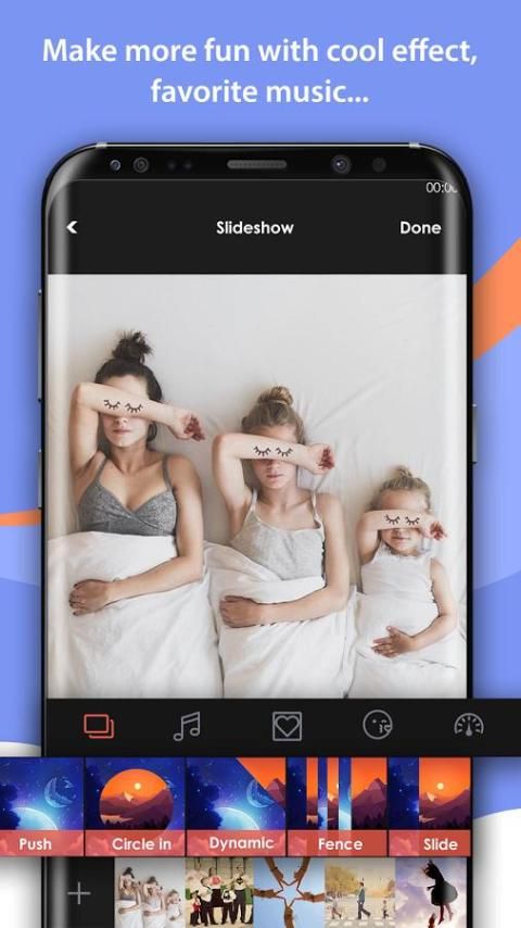 Membuat slideshow dengan musik dari foto dengan lagu mudah! Hanya men-download pembuat aplikasi Photo Slideshow untuk Telepon X!
