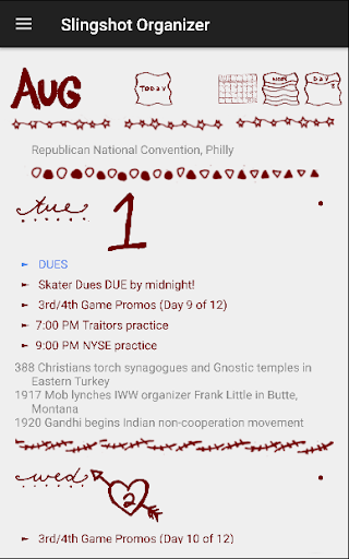 Penyelenggara Slingshot tersedia sebagai aplikasi seluler!Lengkap dengan seni yang ditarik tangan, kalender menstruasi, dan tanggal radikal dari sejarah yang Anda sukai dari versi kertas.Jika Anda belum melihat versi kertas - Anda berada di untuk mengobati.