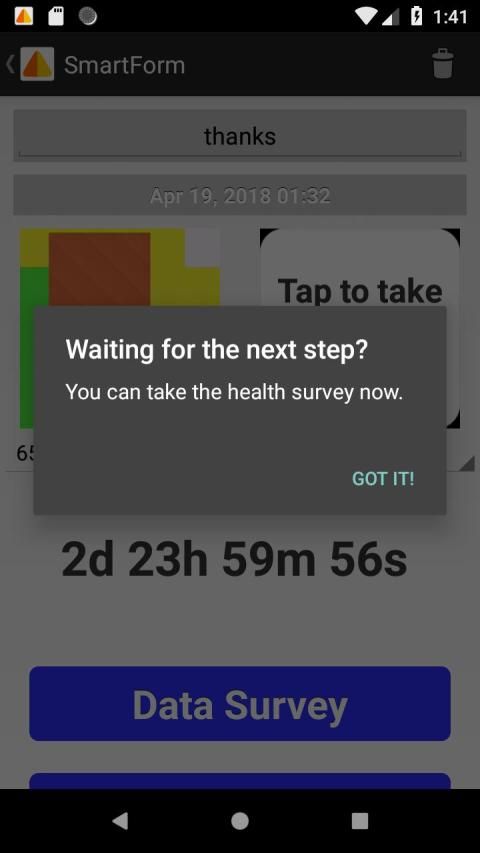 Aplikasi ini bekerja dengan lencana berubah warna untuk mengukur formaldehida. Kami menghabiskan 90% dari waktu kita dalam ruangan dan udara di sebagian besar rumah kita mengandung formalin. paparan formaldehid dapat memperburuk kesehatan. sistem aplikasi dan lencana ini memungkinkan pengguna untuk mengukur paparan formaldehida dalam ruangan mereka. Aplikasi ini memberikan informasi tentang tingkat formaldehida dianjurkan dan tips tentang mengurangi eksposur jika konsentrasi tinggi. Pengguna juga akan diberikan pilihan untuk meng-upload hasil mereka dan menyelesaikan survei untuk membuat database nasional tingkat formaldehida. Survei akan bertanya tentang karakteristik perumahan dan juga termasuk pilihan untuk melaporkan gejala kesehatan. Database ini akan membantu para peneliti dan ilmuwan masyarakat lebih memahami formaldehida di perumahan.