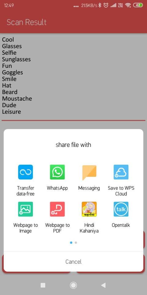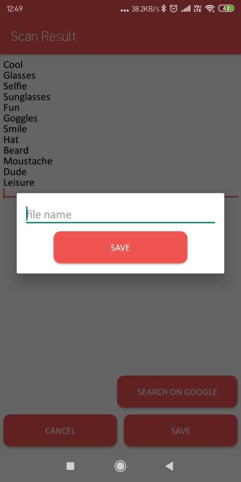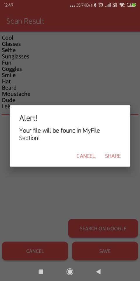 Dalam pemindai ini akan memindai semua objek yang ditampilkan dalam gambar dan memberi Anda opsi untuk menyimpan teks dalam file dan mencari di google dan membagikan file ini ke teman.