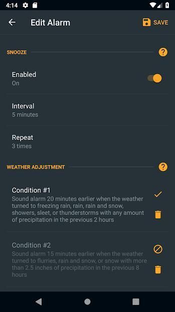 Secara otomatis batalkan alarm Anda jika setidaknya ada 1 inci perkiraan hujan selama 6 jam berikutnya sehingga Anda tidak perlu bangun pagi pada hari-hari Anda tidak dapat bekerja.