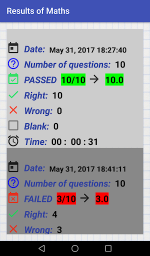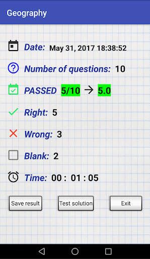 Of each result is saved, the date and time, the number of questions, right questions, wrong questions, blank questions, test score and time spent taking the test.