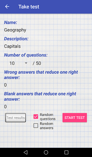 Create the tests with all the questions you want, then you can choose how many questions you want to do, for example, you can create a test with 100 questions, but if you have little time and want to review, you can take the test with only 10 questions.
