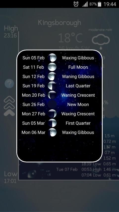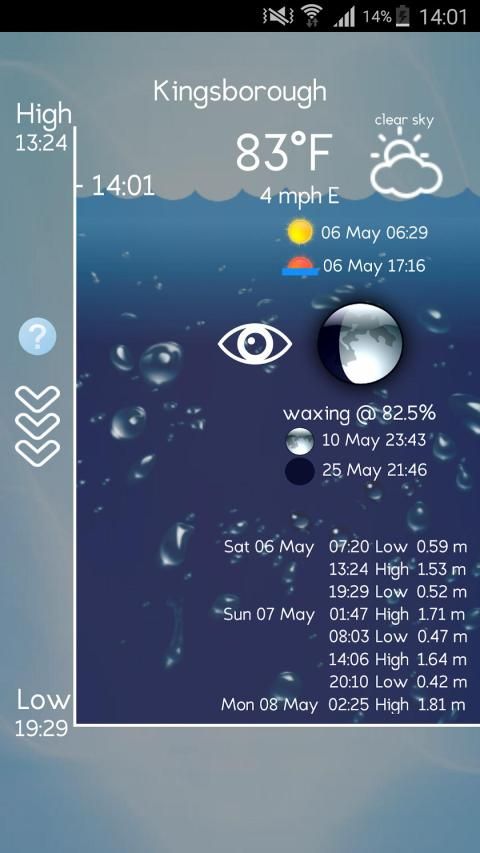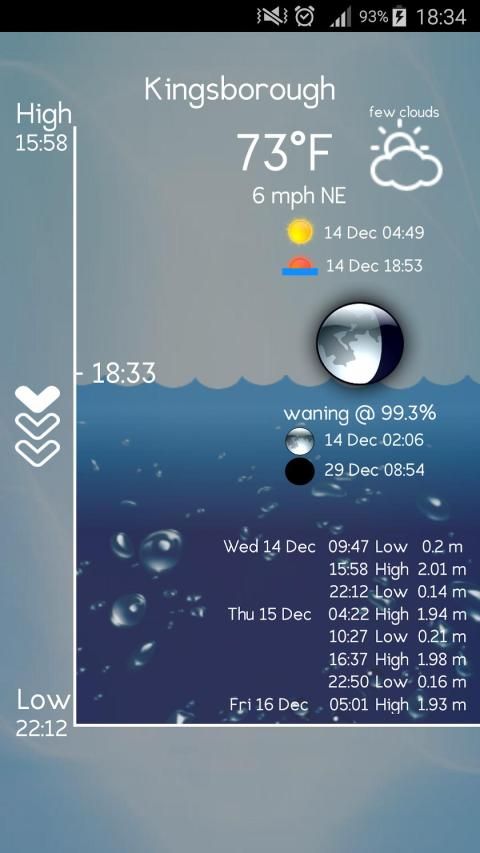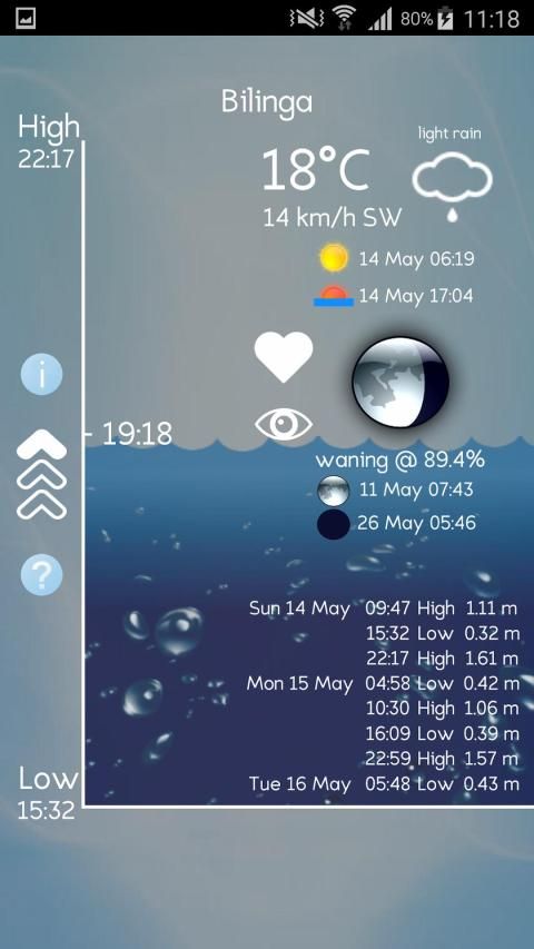 Sebagai surfer saya ingin aplikasi air pasang yang menjawab pertanyaan "apa yang air pasang lakukan sekarang?". Aplikasi pasang lainnya memberikan data dalam tabel dan grafik bahwa Anda harus meneliti untuk menjawab pertanyaan itu. aplikasi saya, serta memberikan tujuh hari dari data pasang, memberikan Anda gambaran yang jelas, mudah untuk memvisualisasikan, dari negara air pasang saat ini, fase bulan dan cuaca saat ini untuk lokasi Anda.