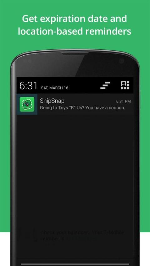 • Pengingat IN-STORE: Bila Anda memasukkan toko, SnipSnap memberikan pemberitahuan push untuk mengingatkan Anda apa kupon yang telah disimpan di sana.