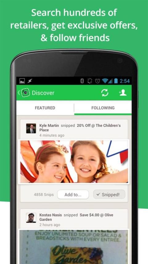 Don't have any coupons handy to scan? Use the Discover screen of the app to see what coupons your friends and family have snipped. You can also snip from or follow our featured coupon bundles, and search our massive database of coupons to find one on demand. Best of all: We'll remind you when you enter a store you have coupons saved for, or when a coupon expiration date is nearing. Aw, snap!