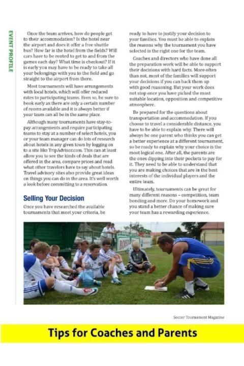 Soccer Tournament Magazine is the ultimate guide for anyone looking for information about adult and youth soccer tournaments in the United States, Canada and beyond. We have articles and information design to help soccer coaches, team managers parents and players get the most out of their soccer playing experience.