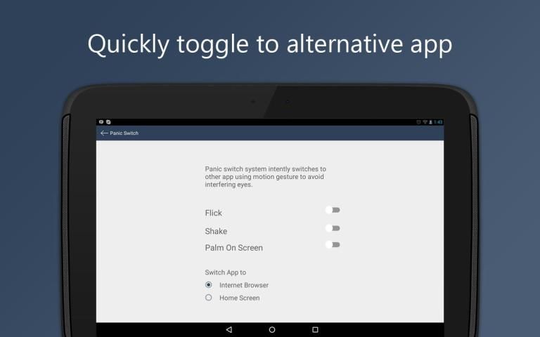 Tidak perlu khawatir jika seseorang mencoba untuk mengintip ke dalam telepon Anda atau tiba-tiba tiba Ketika Anda surfing situs sosial Anda. The Panic Beralih di sini untuk menyelamatkan Anda. Fitur ini Memungkinkan Anda untuk beralih ke aplikasi lain dengan hanya gemetar cepat menjentikkan atau menempatkan telapak tangan Anda pada layar ponsel Anda. Ini Memungkinkan Anda untuk menyembunyikan isi aplikasi dari setiap orang yang lewat.
