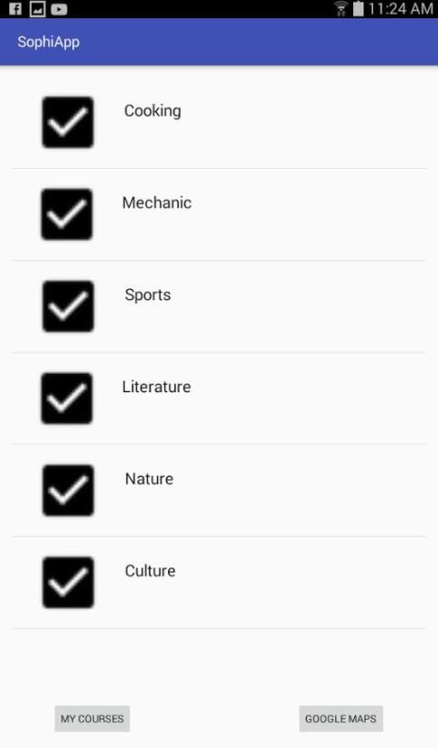 SophiApp adalah sebuah aplikasi di mana orang dapat mencari program dari berbagai kategori, orang dapat mendaftar program yang berbeda yang harus Anda lakukan adalah memilih kategori dan kemudian kelas mereka ingin melihat, jika anda ingin melihat program yang terdaftar hanya harus memeriksa tombol program saya untuk kelas, jika mereka memberikan klik menunjukkan kelasnya informasi ini.