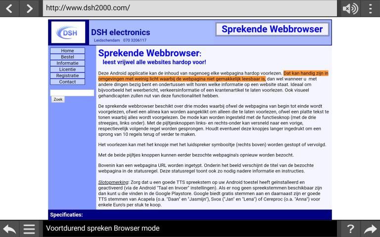 Deze Android applicatie kan de inhoud van nagenoeg elke webpagina hardop voorlezen. Dat kan handig zijn in omgevingen met weinig licht waarbij de webpagina niet gemakkelijk leesbaar is, dan wel wanneer u met andere dingen bezig bent en ondertussen wilt horen welke informatie op een website staat. Ideaal om bijvoorbeeld het weerbericht, verkeersinformatie of een krantenartikel te laten voorlezen. Ook visueel gehandicapten zullen nut van deze functionaliteit hebben.