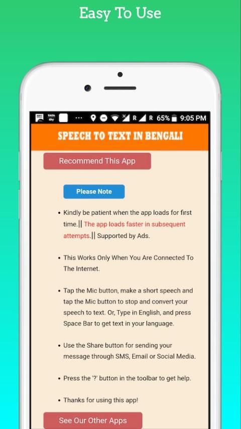 Following is the introduction of a wonderful App. 20,000+ users downloaded SpeechToTextInBengali latest version on 9Apps for free every week! More features are involved in this new version. This hot app was released on 2019-10-30. Enjoy playing with new, amazing features!