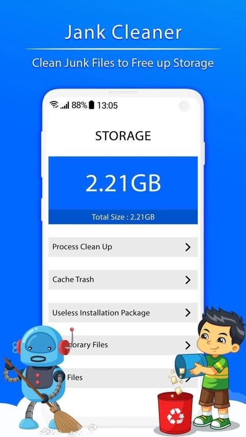 the junk files that slow down your cell phone. With our powerful analytics engine, you will not only get more storage space from the cleaning process of cache, applications, download folders, browser history, and clipboard content and more, one touch and cache or junk files will be cleaned!