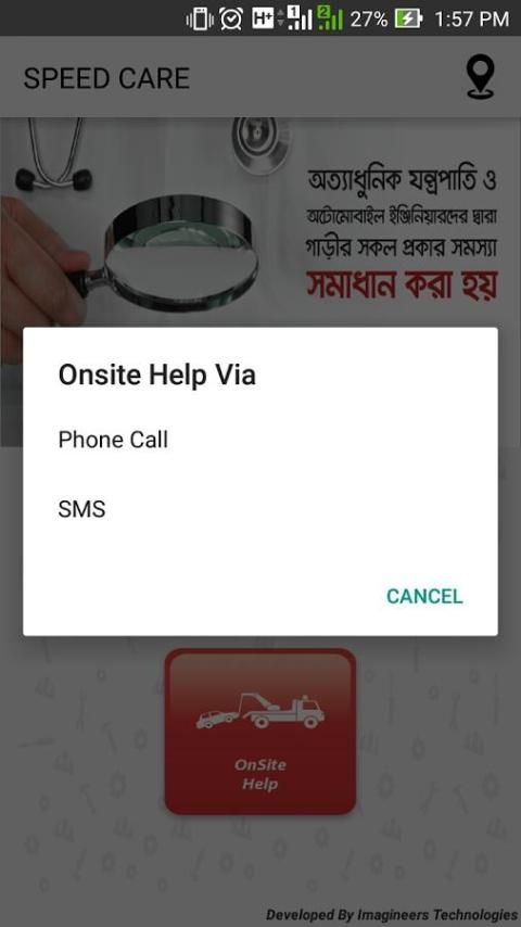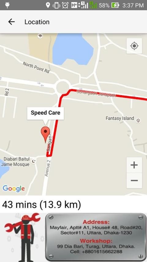 Kecepatan Perawatan juga akan membantu pengguna untuk mendapatkan bantuan langsung jika mereka terjebak di mana saja di dalam Dhaka dengan mobil mereka. Hanya satu klik di aplikasi akan cukup untuk memberitahu kami tahu di mana mobil terjebak dan tim kami akan berada di sana pada waktu untuk menyelamatkan Anda dan mobil Anda.