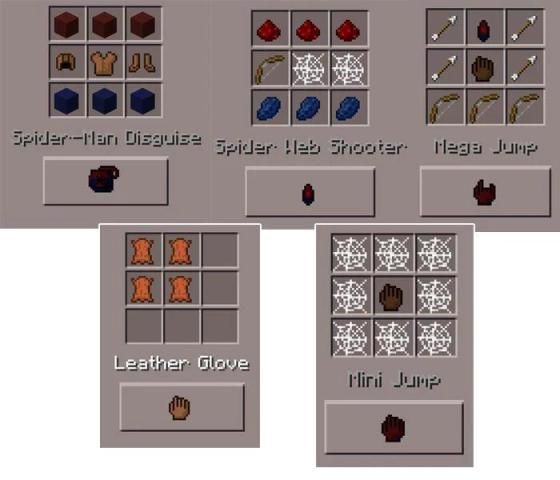 Mod menambahkan satu set baru objek dalam permainan yang dapat dibuat dan digunakan untuk menjadi superhero. Anda tidak hanya terlihat seperti dia, tetapi Anda juga akan memiliki semua kekuatannya, seperti menembak di web dan melompat tinggi ke langit.