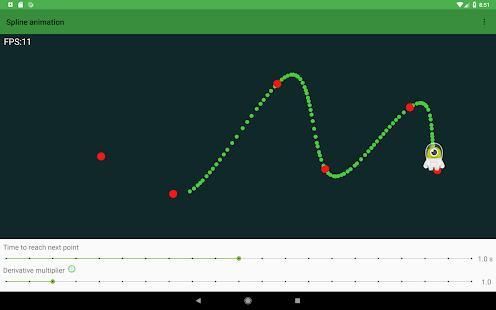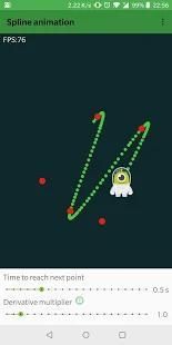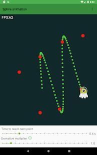 Spline Animator is a demo app that shows how to use a Spline curve to animate a simple sprite. Given a set of points the animator creates a path that passes through these. The set of points is populated runtime by user's tap position. It's possible to change animation speed and a multiplier to increase the derivatives in junction points.