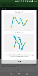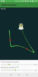 Spline Animator adalah aplikasi demo yang menunjukkan bagaimana menggunakan kurva spline untuk menghidupkan sprite sederhana. Mengingat satu set poin animator menciptakan jalur yang melewati ini. Himpunan titik-titik dihuni runtime dengan posisi tap pengguna. Ini mungkin untuk mengubah kecepatan animasi dan multiplier untuk meningkatkan derivatif di titik persimpangan.