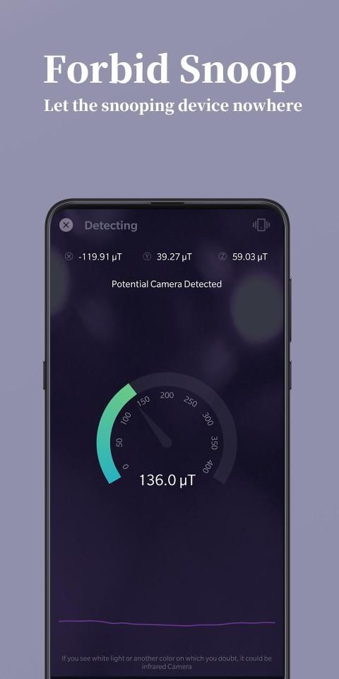 Aplikasi ini menganalisis aktivitas magnetik di sekitar perangkat. Jika aktivitas magnetik mirip dengan kamera tersembunyi, aplikasi ini akan bergetar dan meningkatkan alarm untuk Anda sehingga Anda dapat menyelidiki lebih lanjut.
