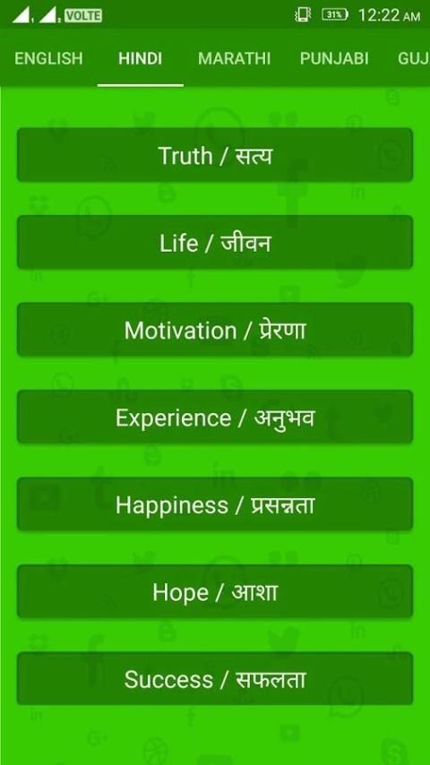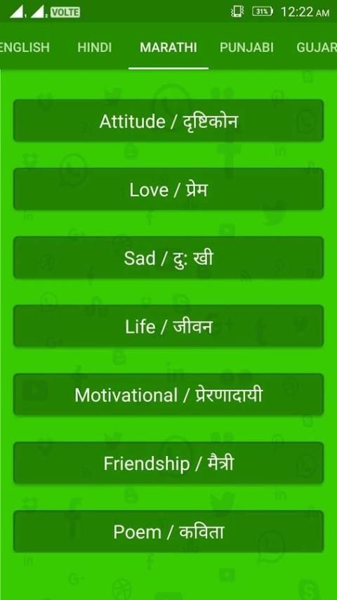 Aplikasi ini berisi pesan status dalam bahasa yang berbeda seperti Hindi, Gujarati, Inggris, Marathi, Punjabi, Tamil, Telugu, Kannad, Bangali.