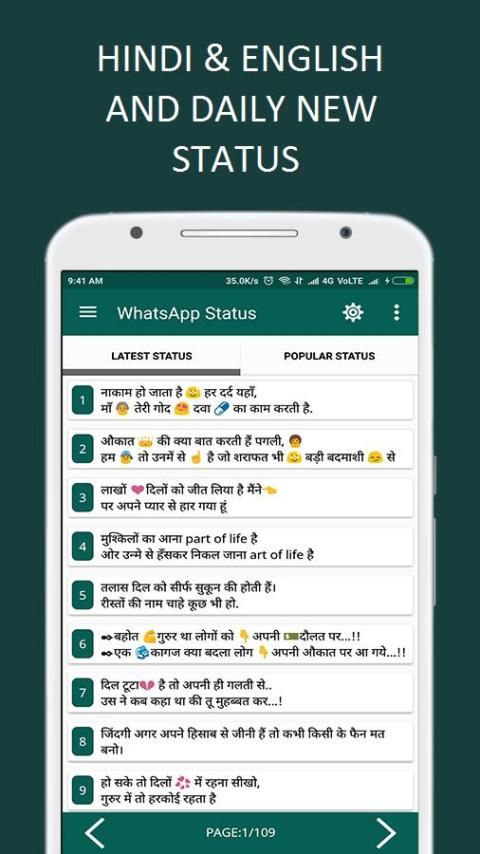 diperbarui secara berkala dan memberikan dosis baru dan segar setiap hari dari Status terbaru untuk WhatsApp, Facebook, WeChat, Line, Viber, BBM dan platform jejaring sosial lainnya. Dengan kemudahan kegunaan dan kualitas Hindi, Status English koleksi semua orang menjadi ekspor status.