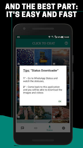 Berguna untuk Mengunduh Status WhatsApp, Berbagi dan Mempertegresi Status Gambar dan Video, dan juga mengobrol dengan kontak tanpa menyimpan nomor ke buku telepon.