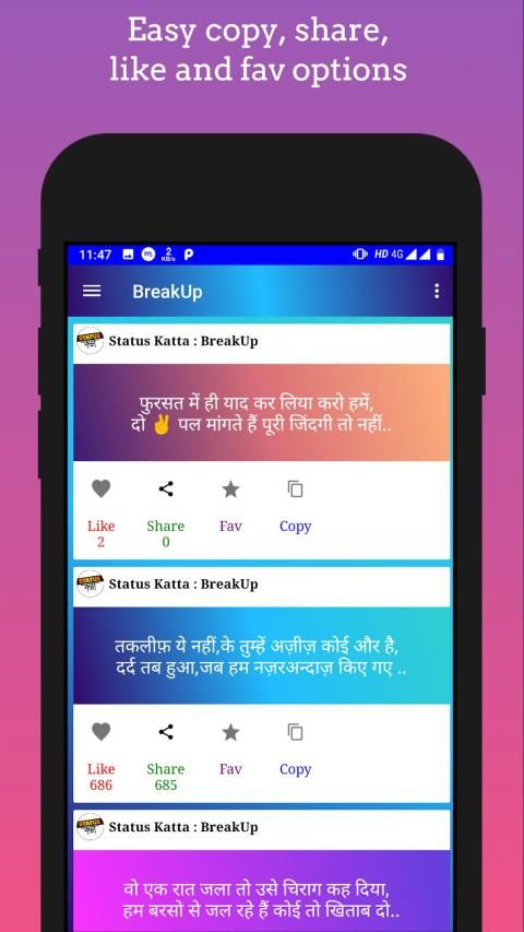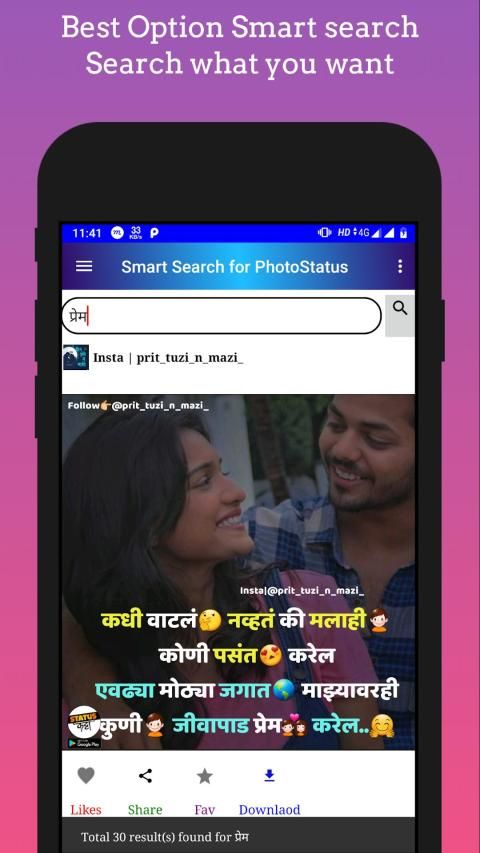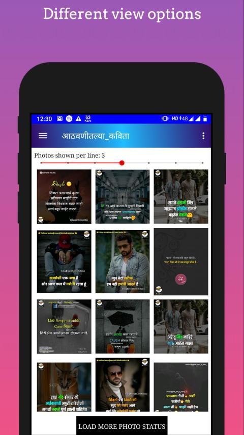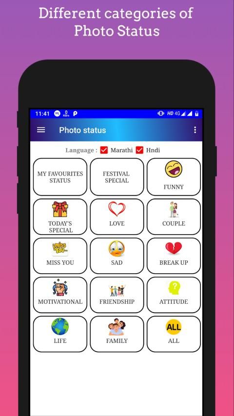 The app contains Marathi status in different formats like text status, photo status. The app also contains different categories of status that is love, couple, sad, motivation and much more.