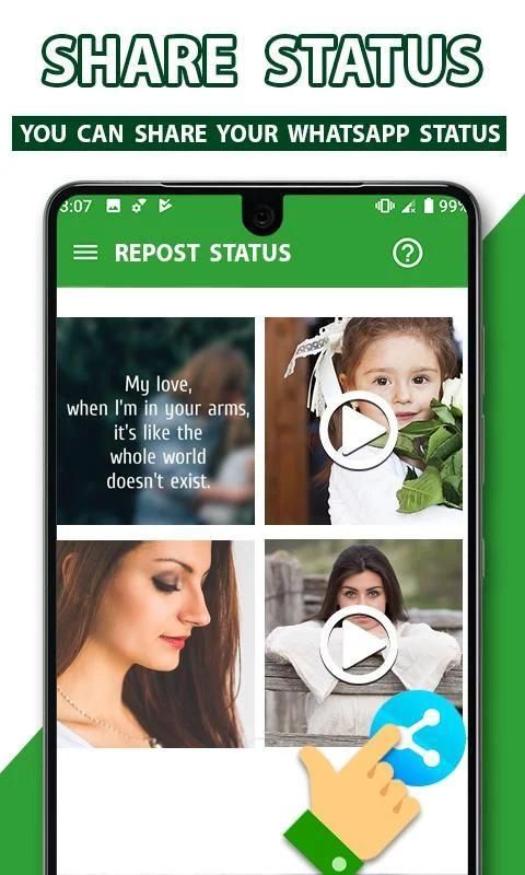 Ini adalah aplikasi yang ramah pengguna yang mudah digunakan, memungkinkan Anda untuk mengunduh status menarik, gambar, GIF dalam hitungan menit dari aplikasi. Ini mendukung untuk versi terbaru dari aplikasi whats juga. Anda dapat membagikan atau mempostingnya lagi dari akun Anda.