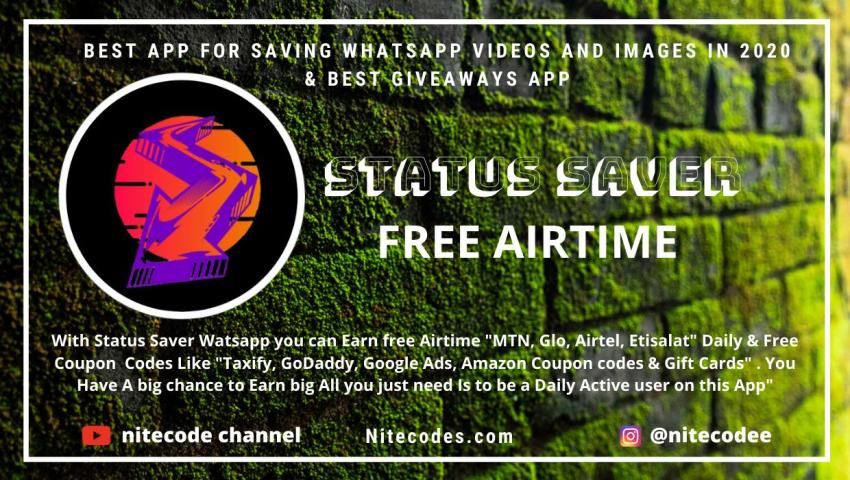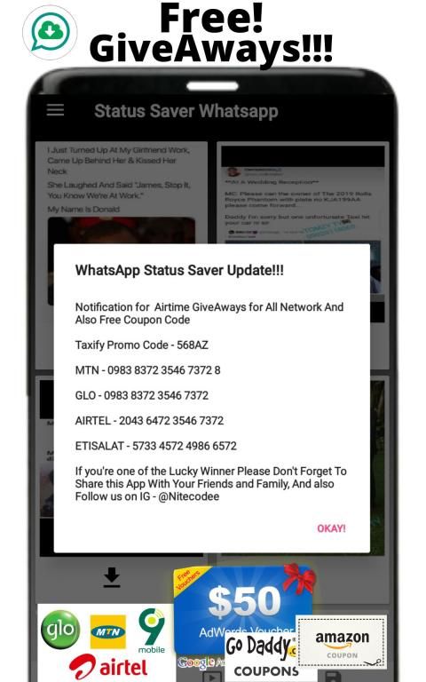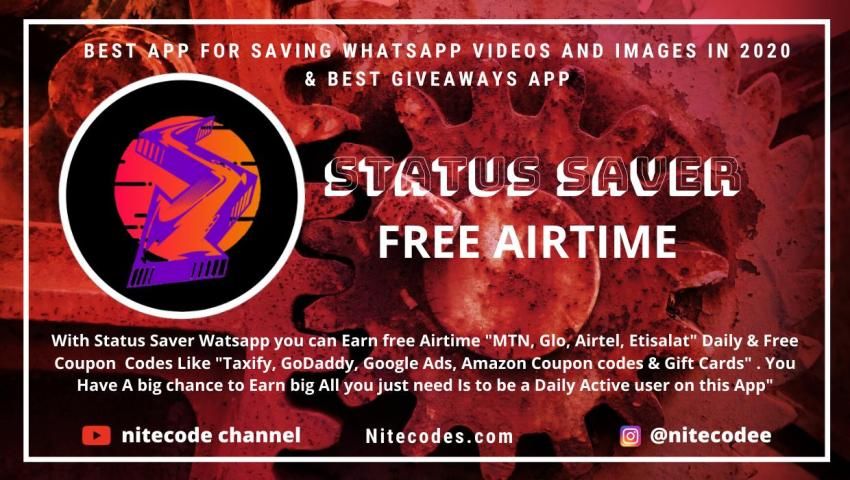 With Status Saver free Airtime you can Earn free Airtime "MTN, Glo, Airtel, Etisalat" Daily & Free Coupon Codes Like "Taxify, GoDaddy, Google Ads, Amazon Coupon codes & Gift Cards" . You Have A big chance to Earn big All you just need Is to be a Daily Active user on this App"