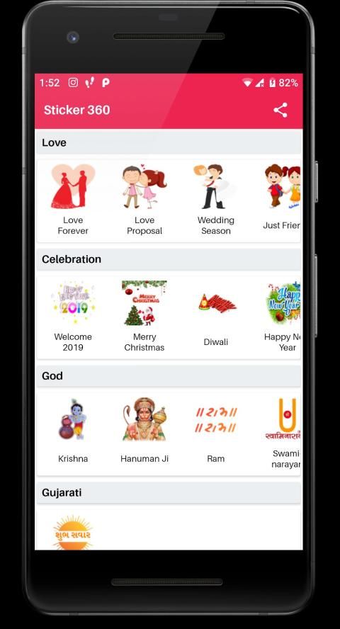 Sticker 360 has collection of stickers from different categories like Love Stickers, Welcome 2019, Merry Christmas, Diwali, Happy New Year, God Sticker, Gujarati Stickers for WhatsApp.