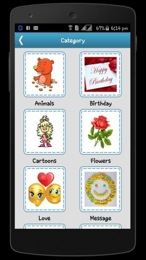 - 9 Kategori termasuk Smiley, Emosi, Hewan, Cinta, Pesan, Kartun, Selamat Pagi, Ulang Tahun dll