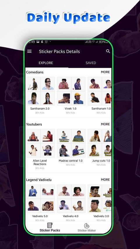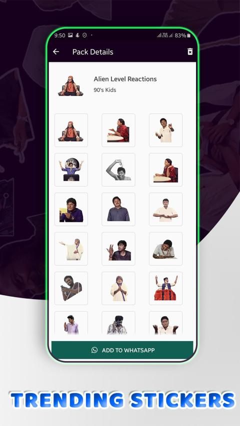 It has 2000+ Stickers including Vadivelu Collection, Thalapathy Vijay Collection, Thala Ajith Collection, Thalaivar Rajini Collection, Uniersal Star Kamal Hasa Collection, Comedians Goundamani, Senthil, Vivek, Santhanam, Yogi Babu, Parota Soori, Music Directors Anirudh and Hip-Hop Thamizha Stickers, and Movies Collections.