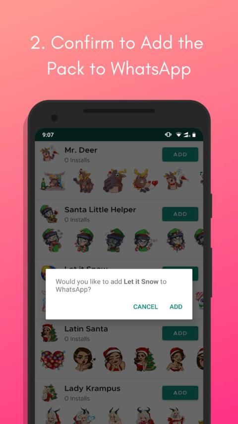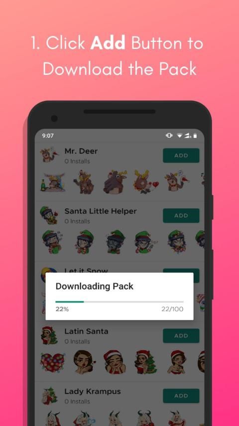 * Just click on Add button for any sticker pack you like. Your sticker pack will be downloaded and you will be prompted with a dialogue to add the pack to WhatsApp.