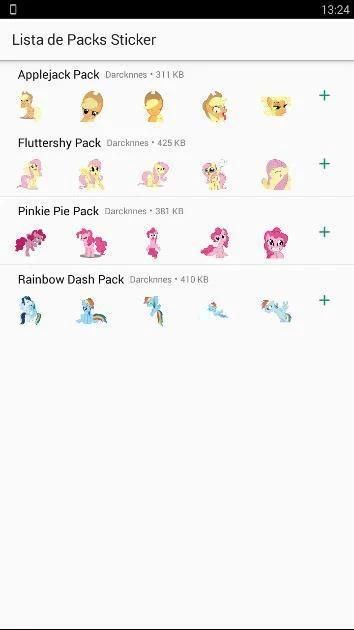 Paket Aneka Stiker yang memiliki 4 folder My Little Pony, dapat diinstal pada perangkat apa pun yang kompatibel dengan versi stiker WhatsApp, Anda dapat menjadikan percakapan Anda sesuatu yang menghibur dan ekspresif dengan gambar-gambar ini tanpa latar belakang, dengan senang hati dan saya harap Anda menikmatinya> 3 <.