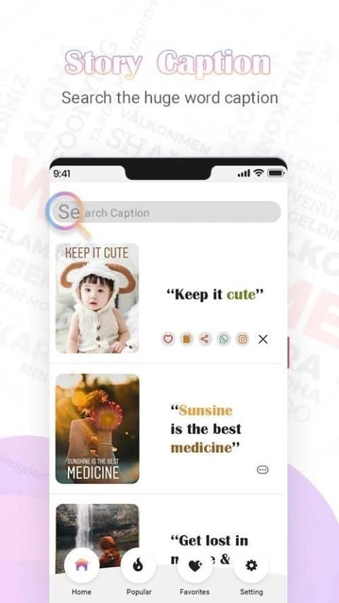 *Add to Favorites:* A caption touched your heart? Just tap on it and tap heart button to add it to favourites. So, you can check it later.