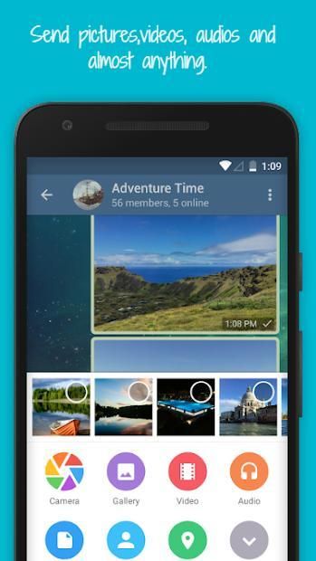 KUAT: Anda dapat membuat obrolan grup hingga 30.000 anggota, berbagi video besar, dokumen jenis apa pun (.DOC, .MP3, .ZIP, dll.), Dan bahkan menyiapkan bot untuk tugas-tugas tertentu. Ini adalah alat yang sempurna untuk hosting komunitas online dan koordinasi kerja sama tim.