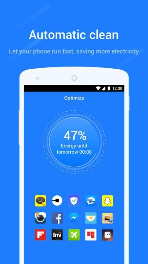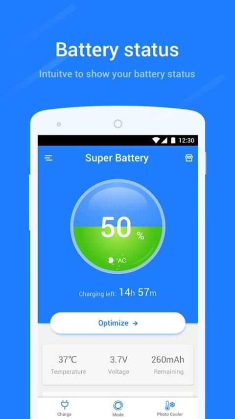 Super baterai akan menunjukkan berapa lama baterai bisa bekerja secara real-time dan mengingatkan Anda berapa banyak aplikasi akan ditutup untuk menghemat daya baterai. Fungsi ini bisa jelas menunjukkan status baterai dan penggunaan. Dan satu klik Anda bisa membersihkan aplikasi yang berjalan di latar belakang untuk meningkatkan kehidupan baterai.