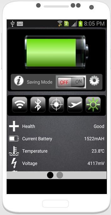 Super baterai akan menunjukkan berapa lama baterai bisa bekerja secara real-time dan mengingatkan Anda berapa banyak aplikasi akan ditutup untuk menghemat daya baterai. Fungsi ini bisa jelas menunjukkan status baterai dan penggunaan. Dan satu klik Anda bisa membersihkan aplikasi yang berjalan di latar belakang untuk meningkatkan kehidupan baterai.