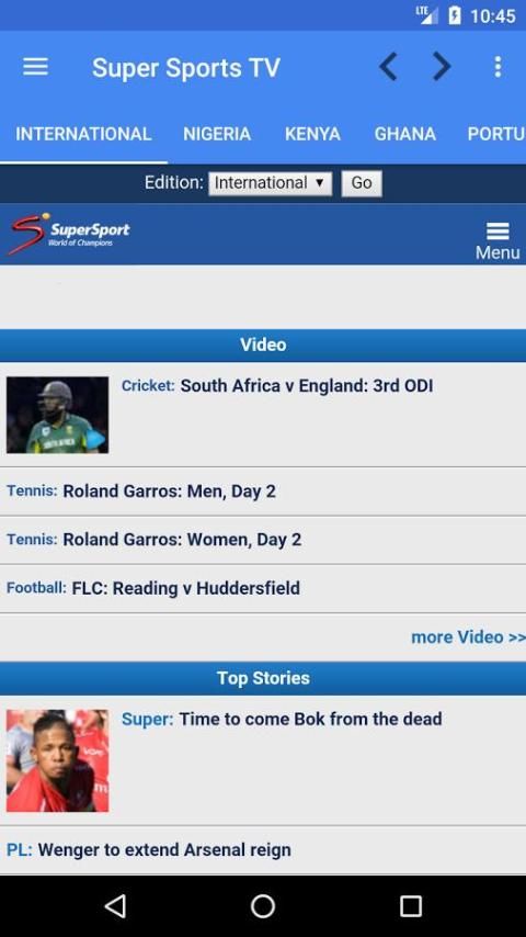 Watch Live Streaming dari semua Saluran TV super Olahraga HD dan video langsung untuk Rugby, Football, Cricket dan banyak lagi, SuperSport dengan antarmuka dirubah akan mengurus semua kebutuhan olahraga Anda, dimanapun Anda berada. Nikmati video highlights, update real-time, hidup komentar, pertandingan chatting dan masih banyak more.Super Olahraga Saluran TV Saluran TV Afrika Selatan.