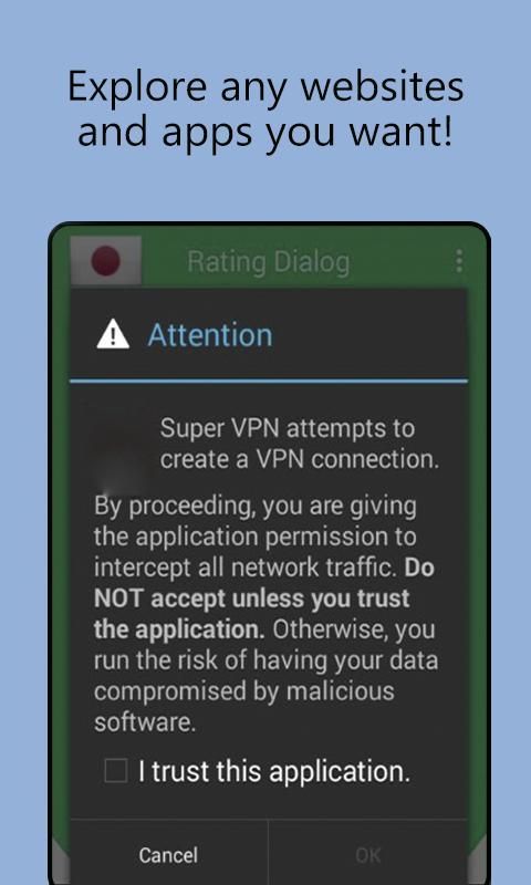 Super Turbo Hot VPN - Proxy Master Gratis Tanpa Batas Terowongan vpn gratis hola gratis terbaik tanpa batas untuk android untuk membuka blokir situs, menonton video online, mengamankan hotspot WiFi dan menjelajah secara pribadi & anonim. Super Turbo Hot VPN - Proxy Master Unlimited Gratis tanpa blokir situs adalah yang terbaik, gratis super Turbo Master VPN, membuka blokir & Vpnmaster proksi bebas blokir super gratis untuk sistem operasi android untuk membuka blokir situs, dengan cara ini master vpn proksi master super bebas membuka blokir situs menikmati online klip video, memotong aplikasi yang tersumbat, mengamankan hot spot Wi-Fi dan menjelajah secara diam-diam dan juga secara anonim. Tercepat - Berhasil terhubung secepat kelinci dengan kecepatan VPN tinggi. Yang termudah - Satu ketukan untuk menghubungkan ke Super Turbo Master VPN - Proxy VPN Master Gratis. Yang Paling Stabil - Memiliki banyak server proxy cloud gratis untuk menyediakan layanan VPN roket yang lebih baik. Super Turbo Hot VPN - Proxy Master Tanpa Batas Gratis, Buka blokir situs web dan aplikasi favorit Anda dengan proxy vpn gratis di seluruh dunia kapan saja.