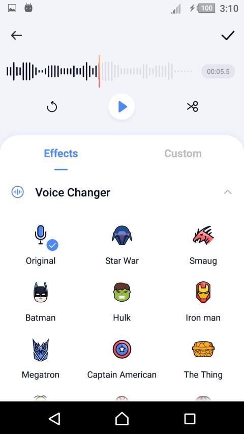 Efek aplikasi pengubah suara yang cerdas dan lucu untuk editor suara, pengubah suara superhero dan pengubah suara messenger. Ada banyak karakter luar biasa yang dapat digunakan untuk mengubah suara Anda menjadi pria atau wanita, anak, pahlawan super, alien, dan sebagainya.