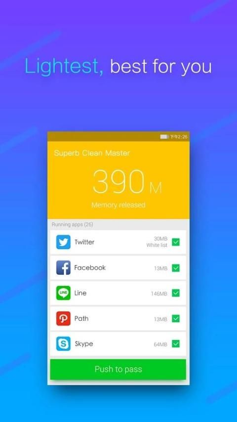 --Free Lebih banyak ruang, hanya satu tekan untuk membersihkan menjalankan aplikasi, sehingga perangkat Anda akan berjalan lebih cepat.