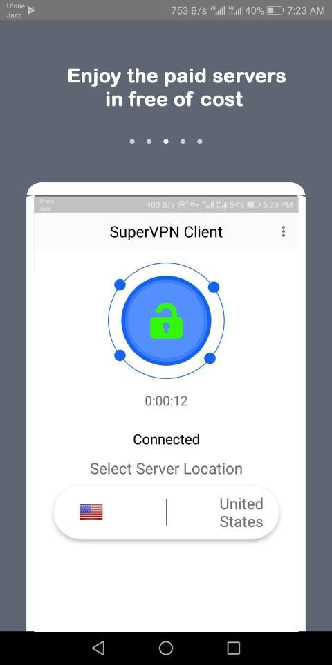 SuperVPN Free VPN Client - Free 2019 work so best vpn defender in order to protect your essential data from harmful attacks.By means of best SuperVPN Free VPN Client - Free 2019 creates protect data, personal information and can use this vpn on android as a school vpn.This of SuperVPN Free VPN Client - Free 2019 app unlock your favorite websites and applications along with Super VPN Hotspot Secure VPN Proxy Master anytime. By using super vpn hotspot free unblock your favorite internet sites as well as application along with super vpn proxy free speed vpn or strong vpn with your limit tap.Super app vpn proxy master free security hides your real ip deal with, surf easy any kind of website that is geographically blocked . Free get access and enjoy proxy through mobiles and other devices through this SuperVPN Free VPN Client - Free 2019 to blocked site and all type videos from any country in which you have, just search with super vpn turbo with free unlimited fast vpn. Super vpn is free unlimited No speed limitation, no bandwidth limitation.use, one click to connecting VPN and enjoy every time everywhere.