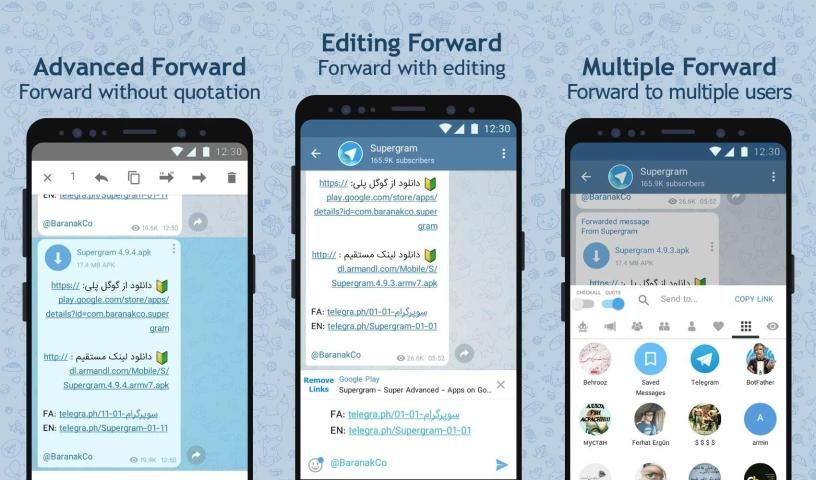 - Advanced forward: Changing text before sending, changing or adding the text under image or before sending a photo or video, adding text to Gif before sending, all with advanced forward.